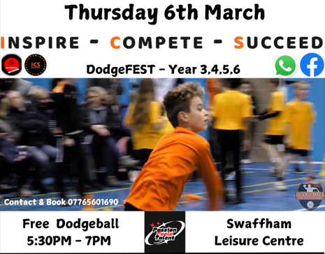 Join us on 6th March at Swaffham Leisure Centre for DodgeFest, an action-packed event for Years 3, 4, 5, and 6—completely FREE!